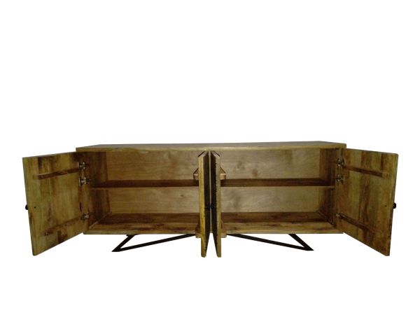 Le reste de cette enfilade est en acacia massif à la finition huilée dont les reflets soyeux et satinés confèrent une polyvalence à ce meuble de style ethnique qui pourra s’accorder à des ambiances contemporaines où perce la nature et l’attrait pour des destinations lointaines et dépaysantes.