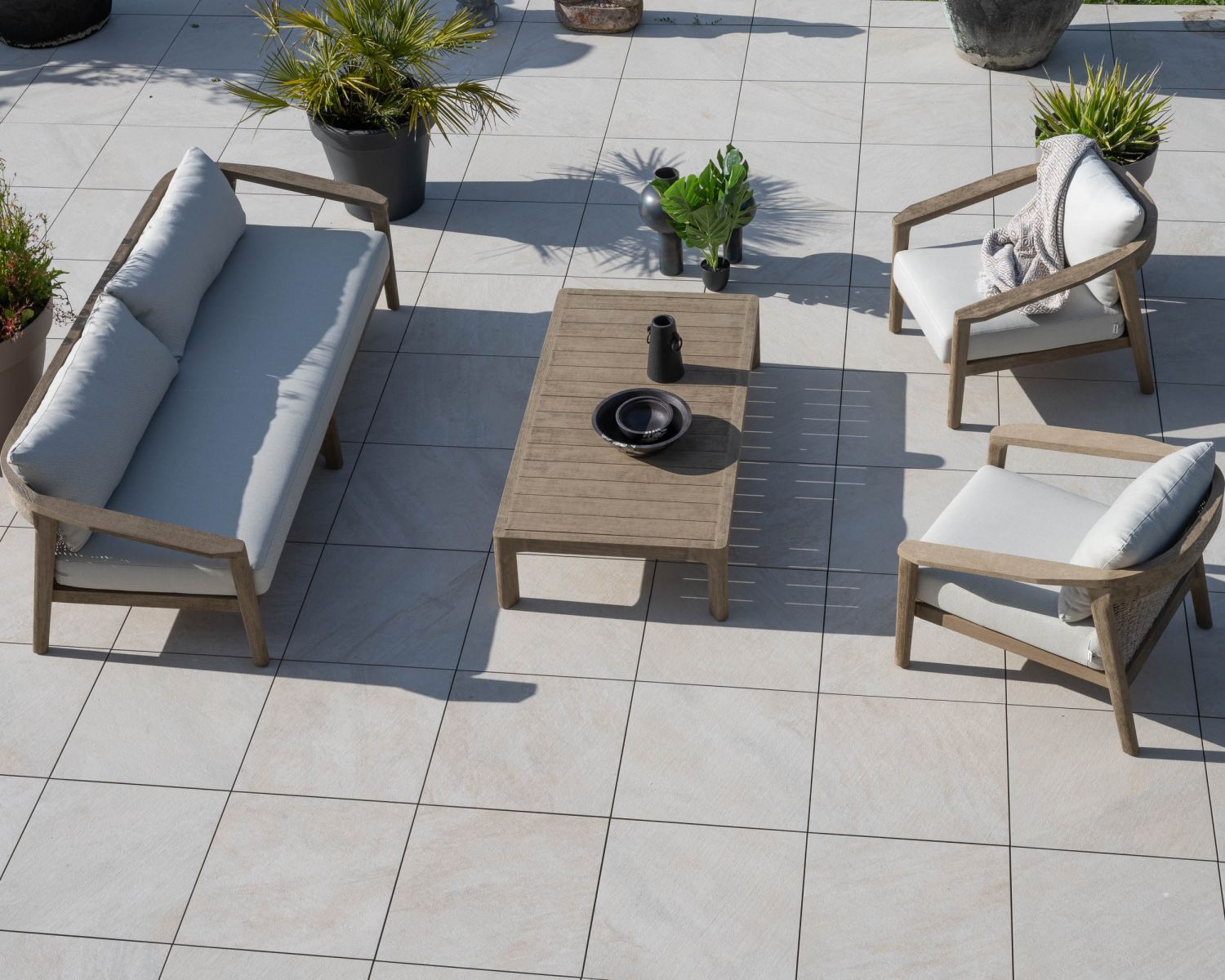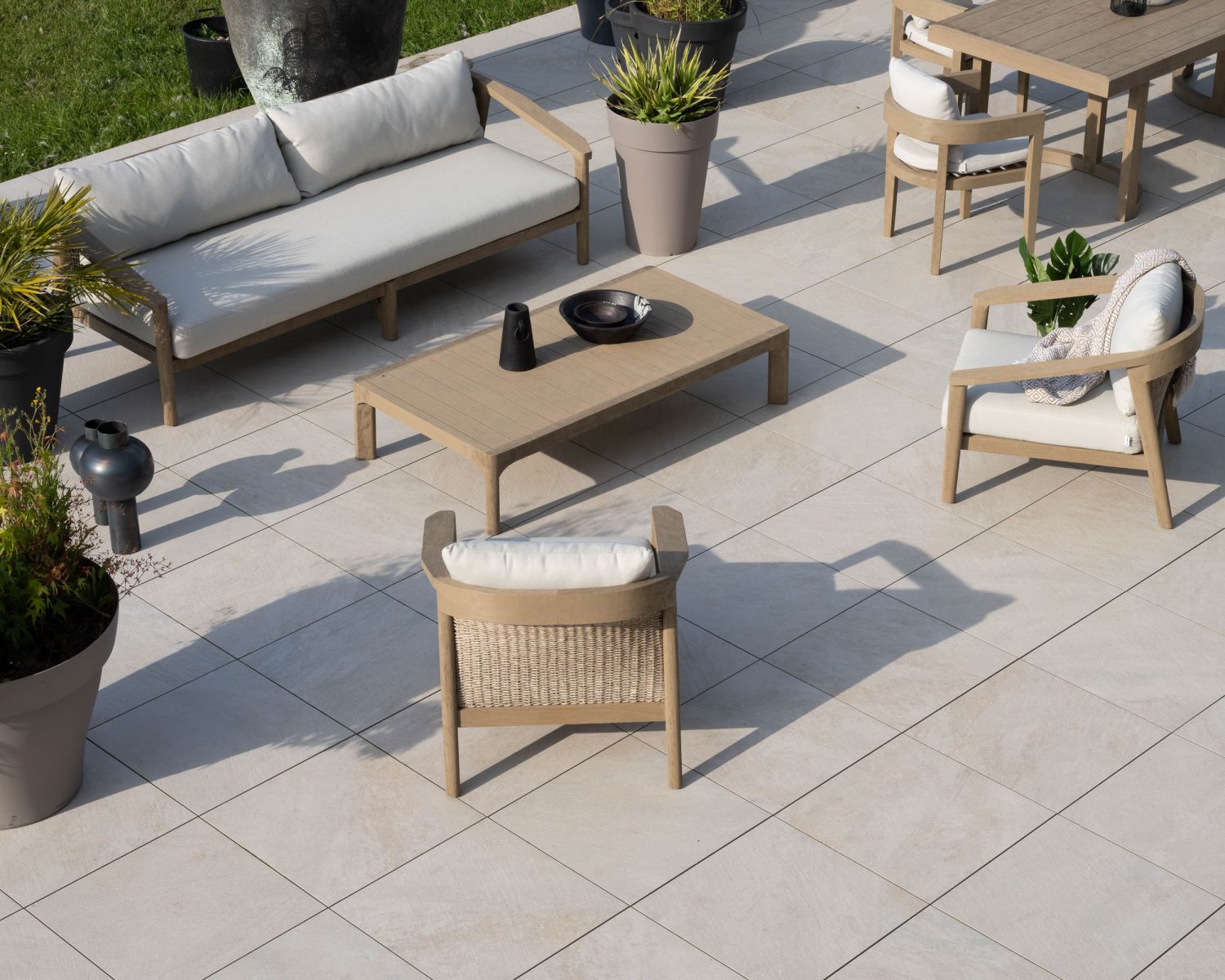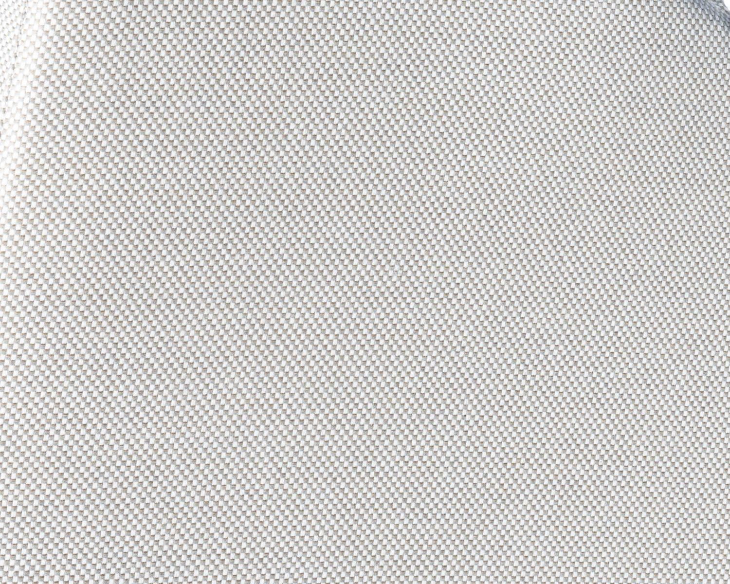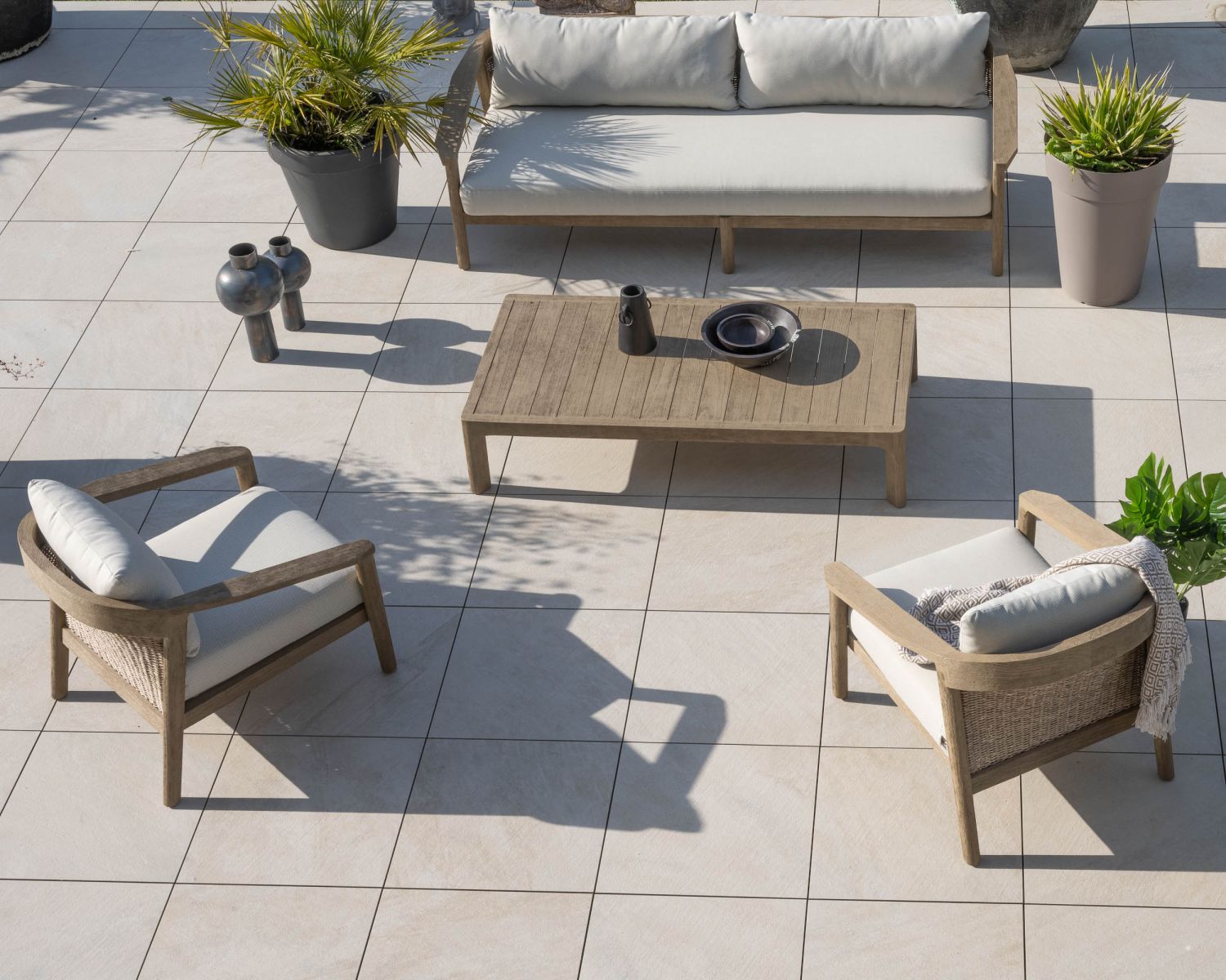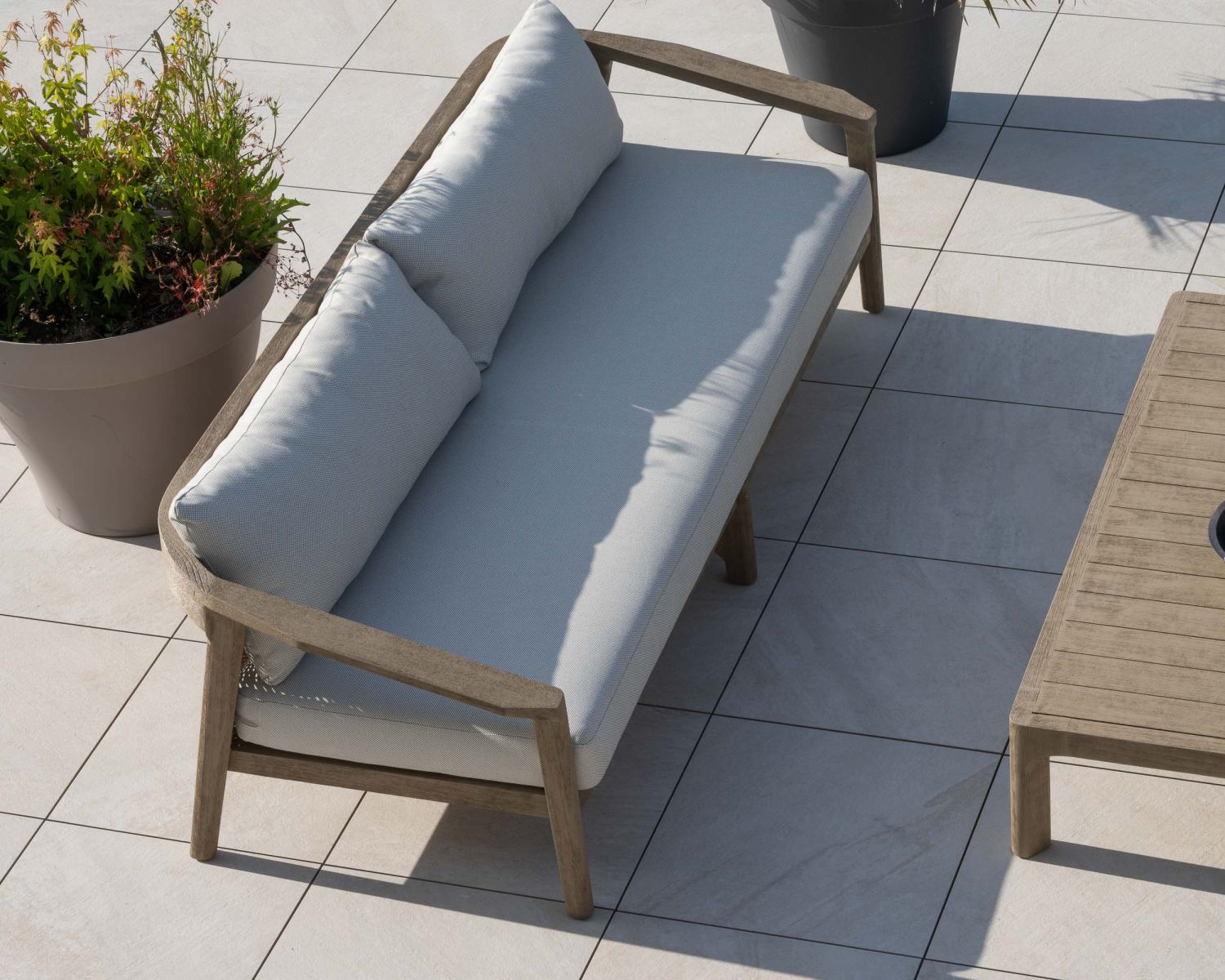 Les assises sont habillées de coussins en tissu écru chiné spécial extérieur, conçus pour résister aux conditions extérieures tout en garantissant un confort agréable.