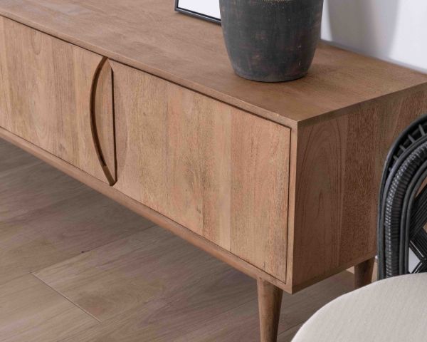 Ce grand meuble TV de la collection « Cabure », confectionné dans un bois de manguier soigneusement sélectionné, représente le mariage parfait entre esthétique et fonctionnalité.