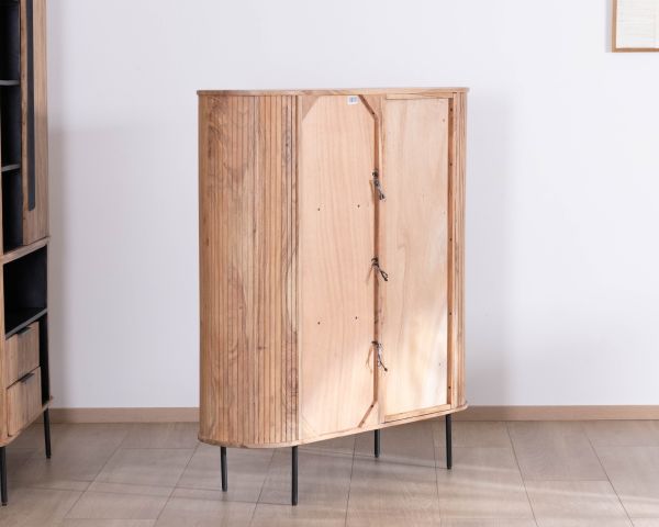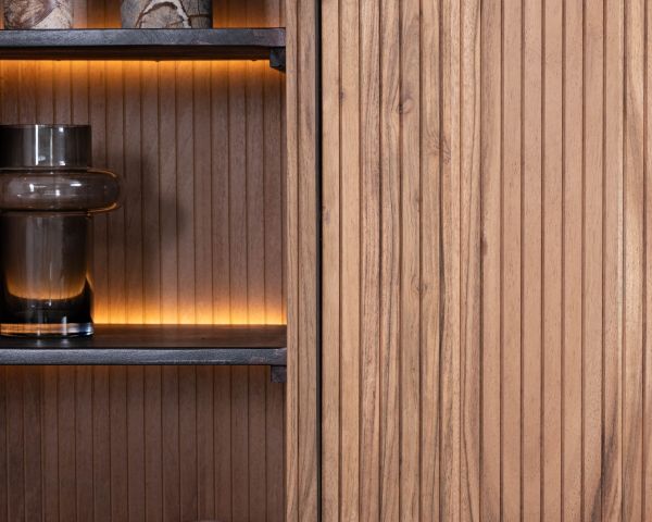 Intérieur partie niche peint en noir avec fond habillage acacia finition striée