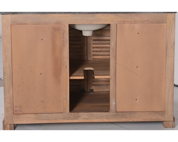 Le contraste entre le coloris miel du bois et la profondeur minérale du plateau lui confère une personnalité forte, entre charme brut et élégance intemporelle. Facile à poser au sol, ce meuble s’intègre naturellement dans une salle de bain soignée.