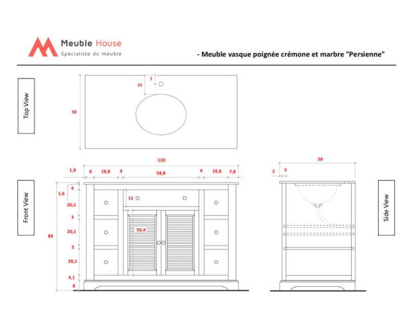 Hors tout : Longueur : 120 cm ; Profondeur : 56 cm ; Hauteur : 90 cm