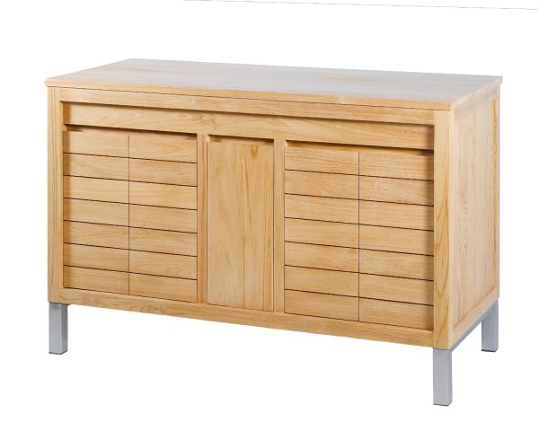 Le teck massif, essence idéale pour un mobilier durable dans les pièces humides, ravira vos pupilles par la finesse de son veinage subtil et habilement travaillé pour donner du relief et de la légèreté à la volumineuse structure de ce meuble, jouant sur les lignes verticales des portes et l'horizontalité des fibres du bois.