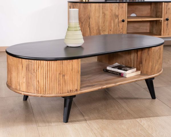 Véritable pièce centrale du salon, cette table de salon ovale en bois massif attire le regard sans jamais surcharger l’espace. Ses courbes douces et ses contours gaufrés invitent à la détente et adoucissent les lignes d’un canapé contemporain, tandis que son style vintage revisité s’intègre naturellement dans une décoration authentique, ponctuée de matières naturelles et de détails travaillés.