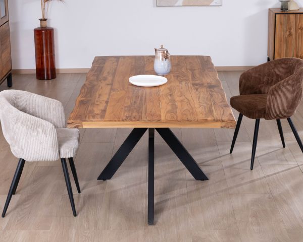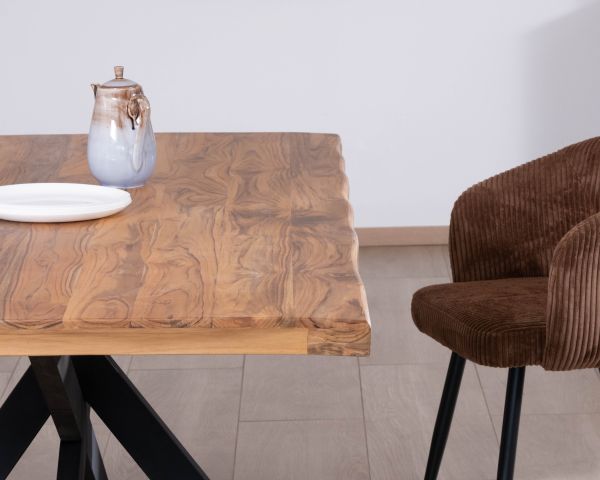 NB : Le bois d'acacia présente naturellement une palette de couleurs variées dans la gamme des bruns chocolat, allant du très clair au très foncé ainsi que des dessins bien marqués ce qui apporte toute sa personnalité au plateau. Le jeu de couleurs et de veinages peut présenter de petites différences avec le modèle présenté et varier d'un meuble à l'autre, ce qui fait que chaque pièce possède un caractère unique.